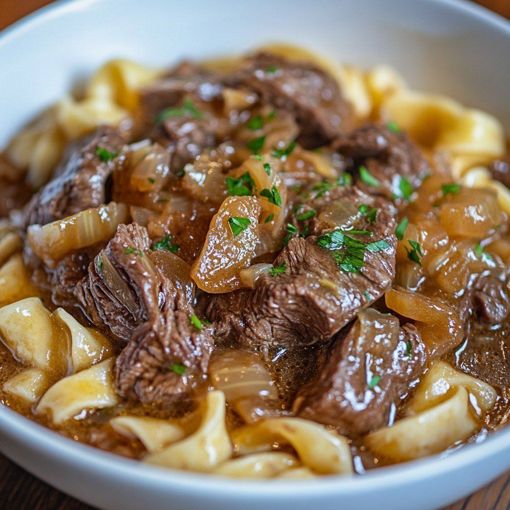 Inspired by the beloved French onion soup, this recipe captures the essence of caramelized onions and savory broth but adds the hearty texture of tender beef and noodles. It’s like enjoying a gourmet stew and pasta dish all in one bowl — filling, delicious, and satisfying.