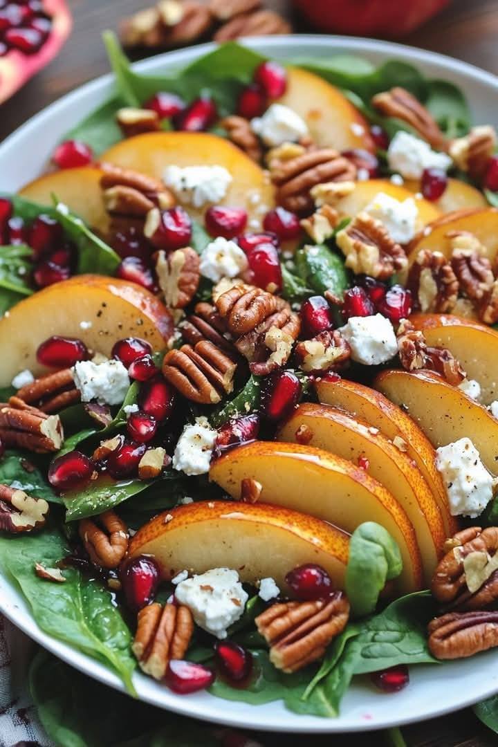 Pear Spinach Salad with Pecans, Dried Cranberries, Feta, Pomegranate, and Maple-Lemon Dijon Mustard Dressing đŸ„—đŸ